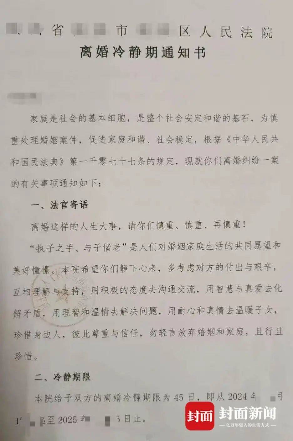 ▲周燕收到的“离婚冷静期通知书”。来源:封面新闻