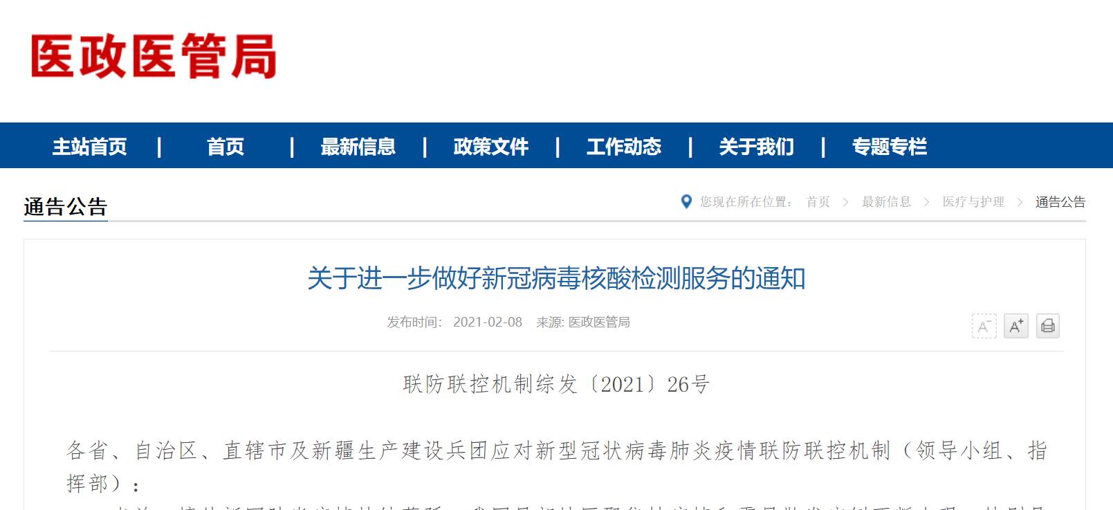 国家卫健委网站2月8日发布《关于进一步做好新冠病毒核酸检测服务的通知》。通知指出,鼓励同时提供单样检测和混样检测服务,供群众自行选择,并在醒目位置公示核酸检测价格。单纯进行核酸检测的群众,无需挂号且免收门诊诊察费。