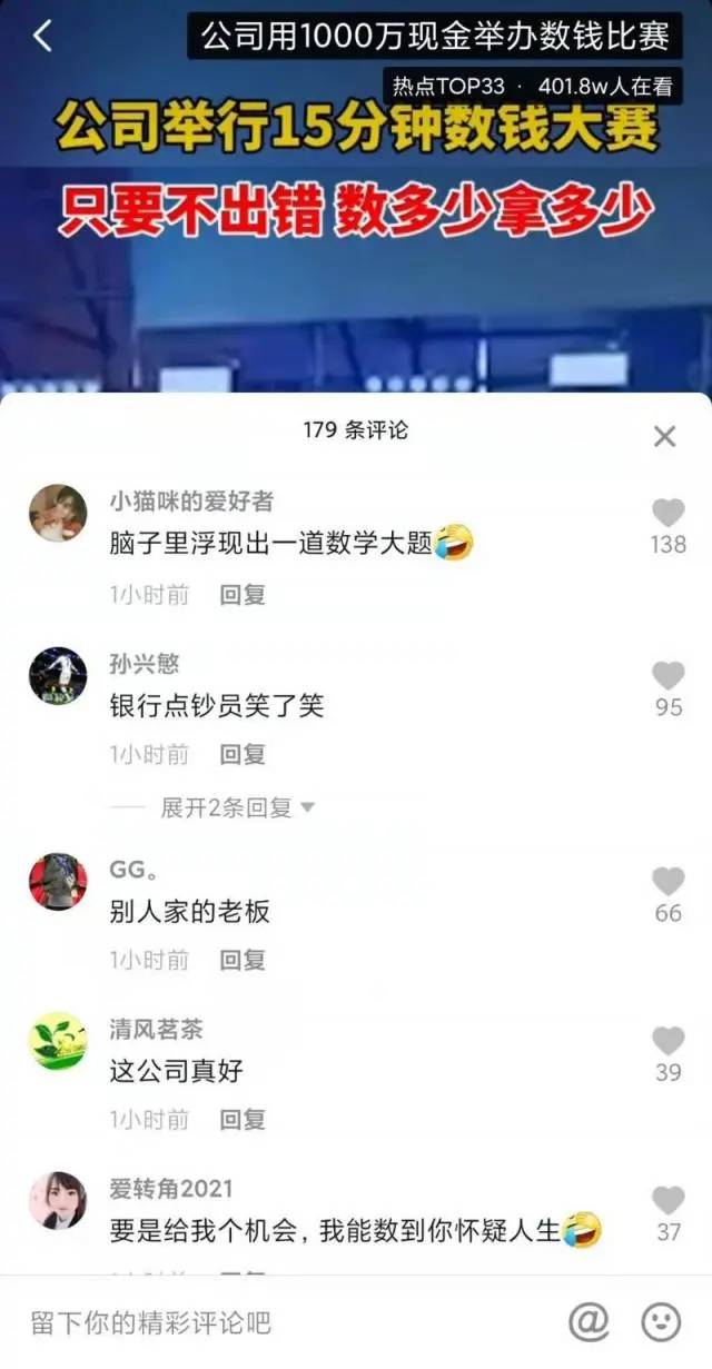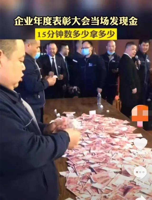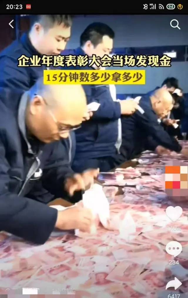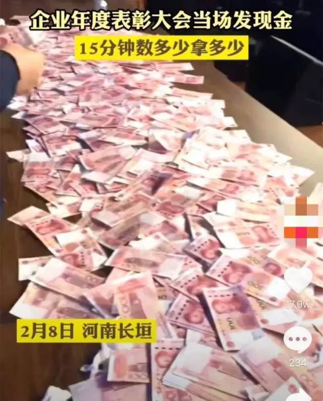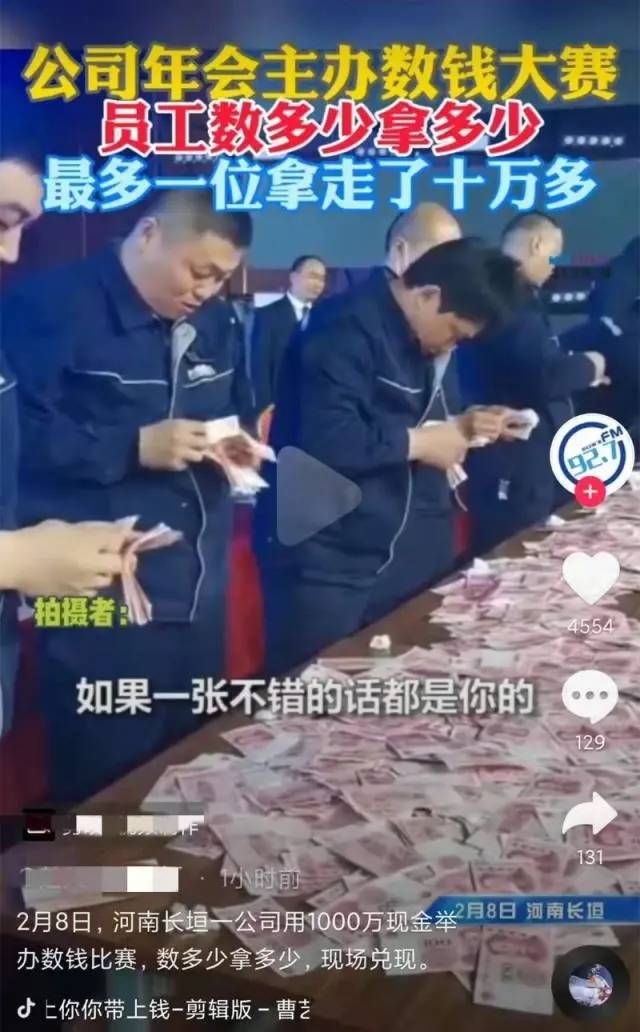 2 月 8 日,一则"公司用 1000 万元现金举办数钱大赛"的短视频迅速登上平台热搜榜。视频显示,在河南省长垣市,河南某公司的年度表彰大会上,员工围着摆满钱的大桌,进行限时数钱比赛活动。