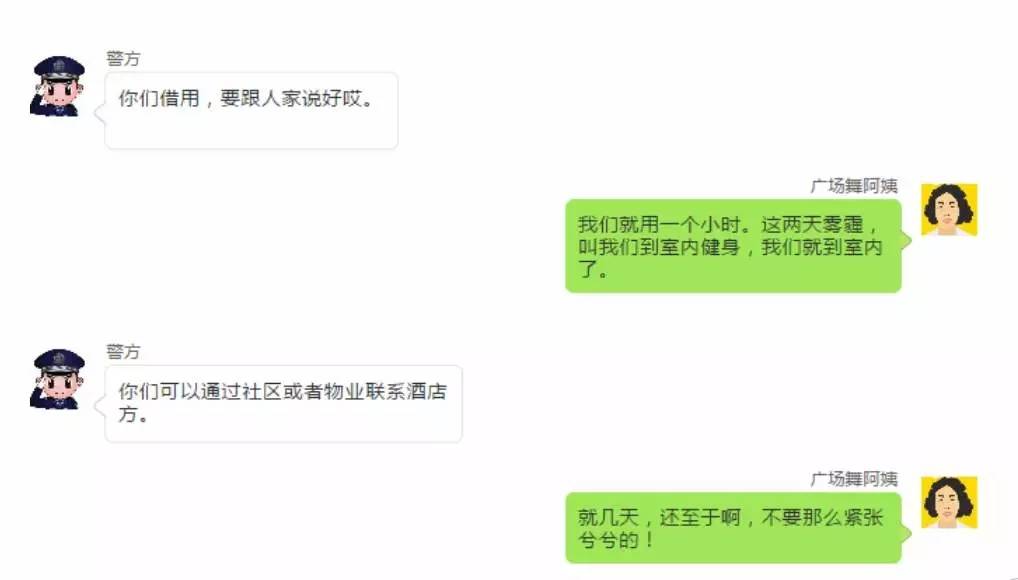 民警提醒,阿姨们跳广场舞的初衷没问题雾霾天选择转战室内也是可以的。但前提是,不能干扰正常的营业秩序,除非和对方协商取得同意后,才能进入。