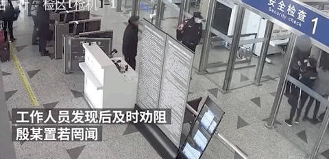 近日,江苏盐城,火车站工作人员对进站旅客进行安检时,男子殷某强行通过人工通道进站。