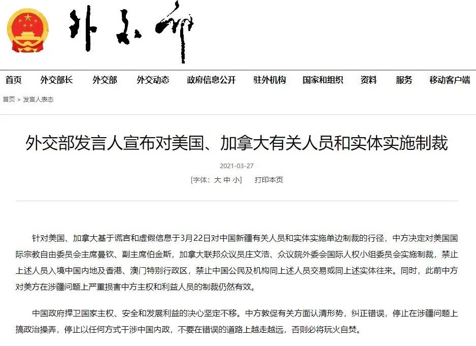 针对美国、加拿大基于谎言和虚假信息于3月22日对中国新疆有关人员和实体实施单边制裁的行径,中方决定对美国国际宗教自由委员会主席曼钦、副主席伯金斯,加拿大联邦众议员庄文浩、众议院外委会国际人权小组委员会实施制裁,禁止上述人员入境中国内地及香港、澳门特别行政区,禁止中国公民及机构同上述人员交易或同上述实体往来。同时,此前中方对美方在涉疆问题上严重损害中方主权和利益人员的制裁仍然有效。