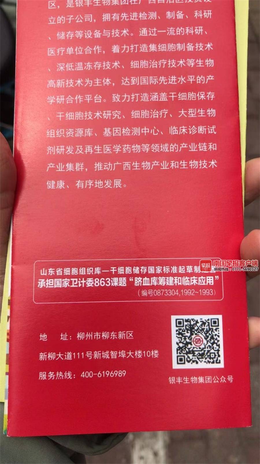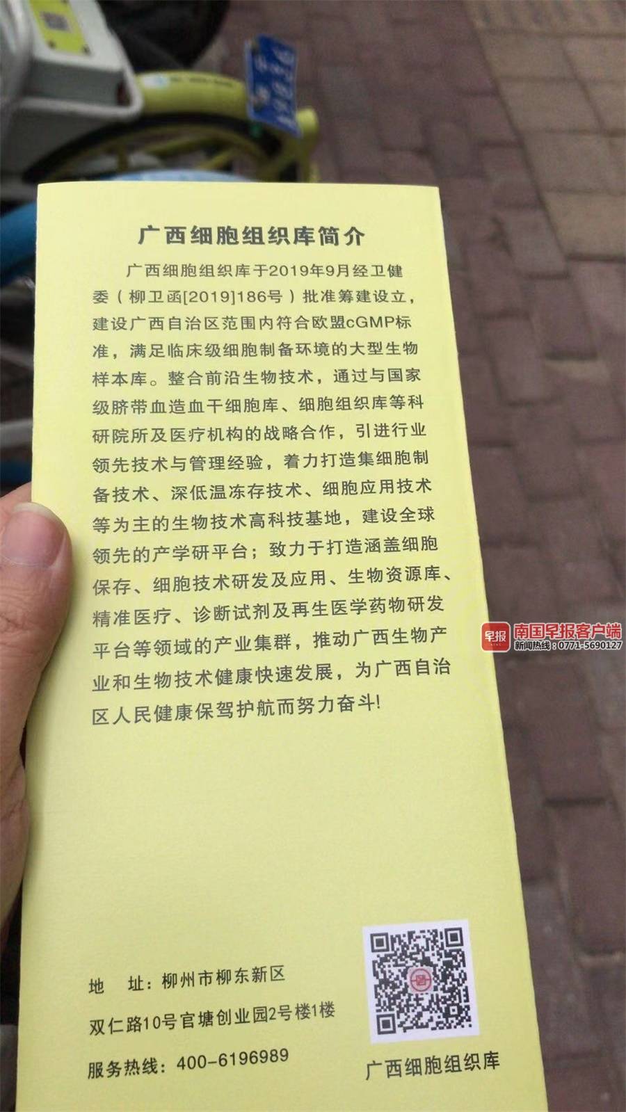 在走访广西民族医院时,南国早报客户端记者在宣传栏里看到了关于造血干细胞的宣传折页,介绍的是一家名为广西细胞组织库的机构。于是,记者以咨询对象的身份,拨打了折页上的联系方式。