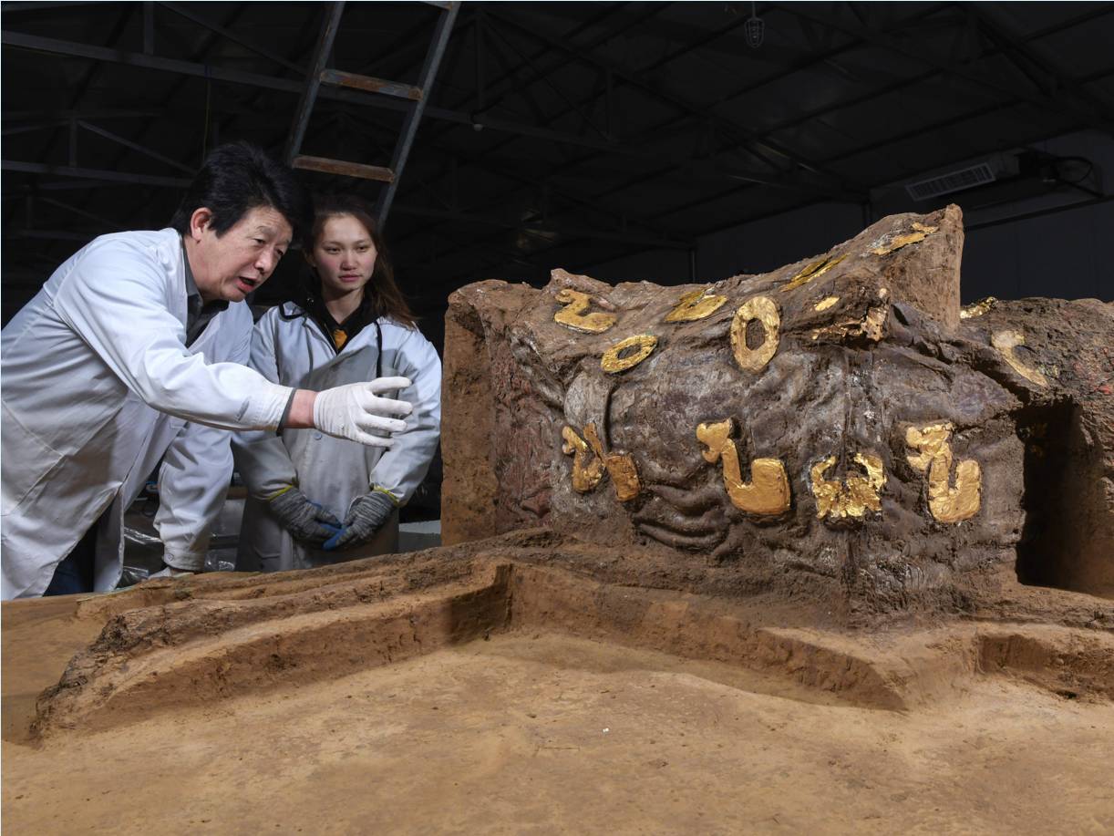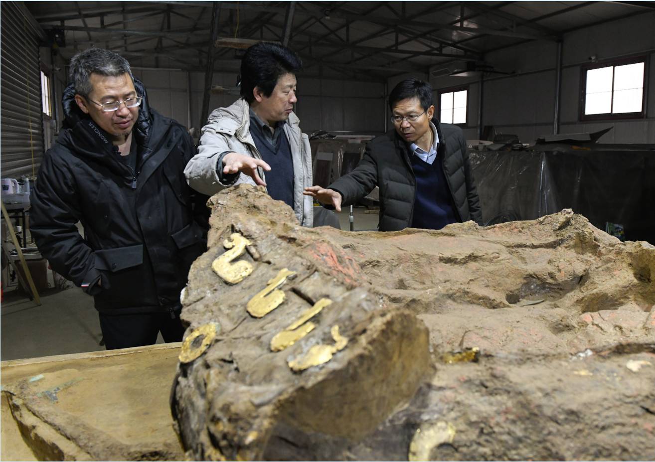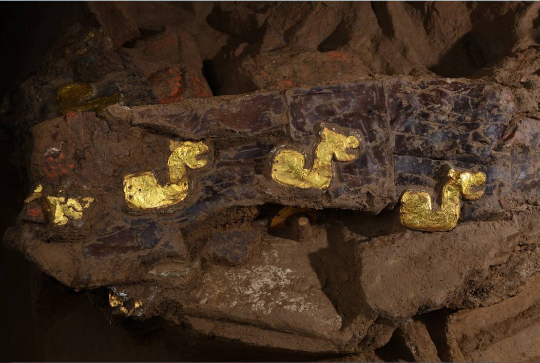 记者在实验室考古现场看到,两个斜置于车厢之上的车轮已被工作人员采取相关技术手段分别摘取,正在进行加固处置和保护程序。车厢左右侧和前后端立板的外表除了饰有繁复的髤漆彩绘图案外,还镶嵌有成组对称的金属质兽型牌饰,其表层粘贴有刻画纹饰的金箔饰片,虽历经约2500年的埋藏,经发掘清理后依旧折射出耀目的金光。