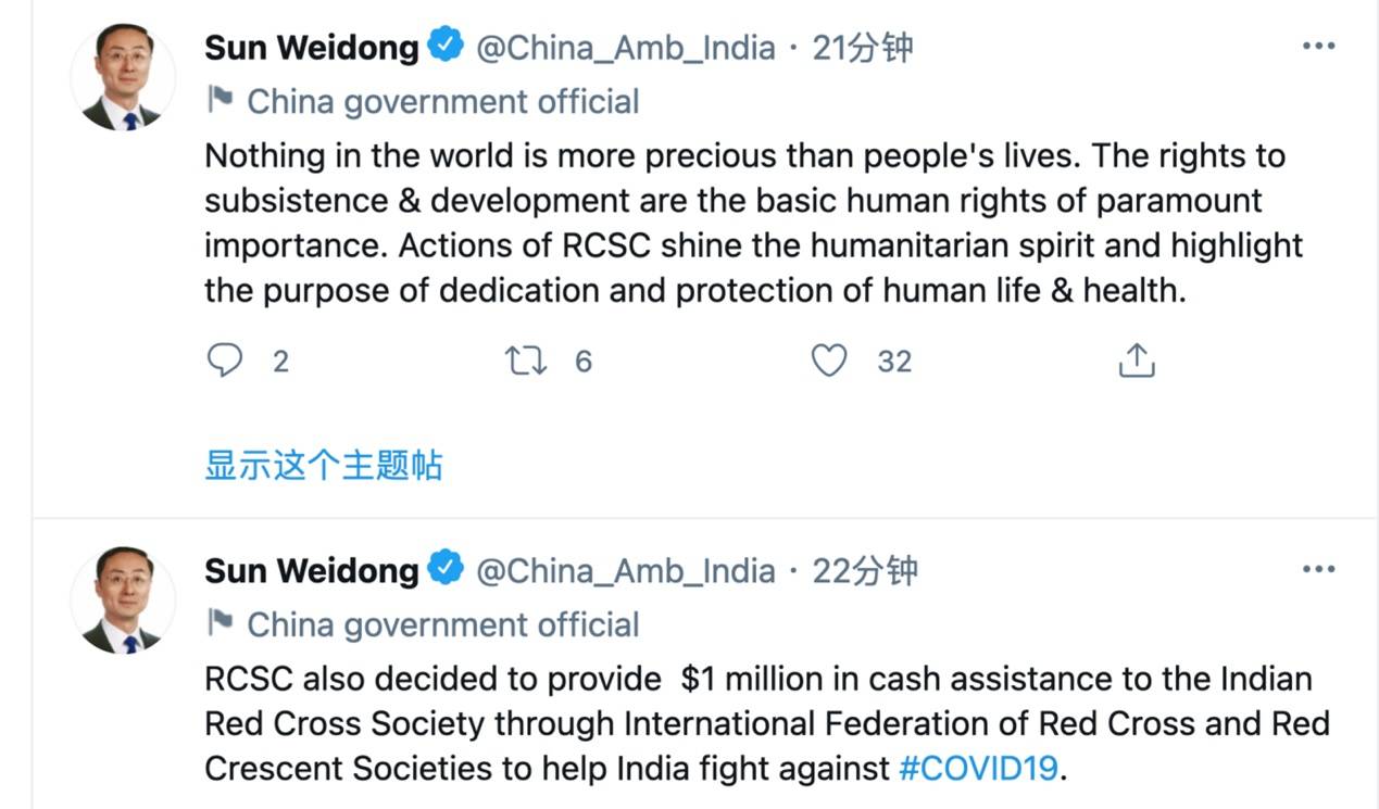 在随后的两条推文中,孙卫东还表示,中国红十字会决定给印度红十字会提供100万美元的现金援助,帮助印度抗疫。