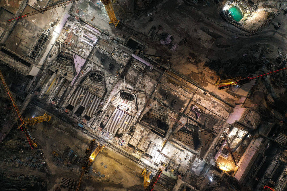▲大藤峡水利枢纽位于广西桂平市西江流域上的黔江河段,是国务院确定的172项节水供水重大水利工程的标志性工程。这是工程夜间建设现场(无人机照片,1月15日摄)。