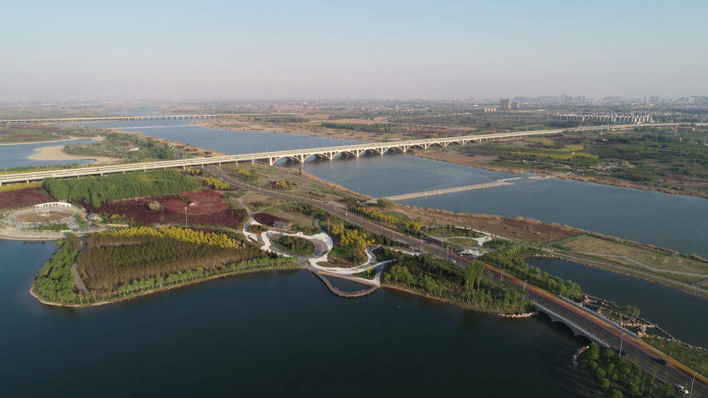 ▲南水北调生态补水,让干涸了几十年的石家庄母亲河——滹沱河重现生机(无人机照片,2021年4月13日摄)。
