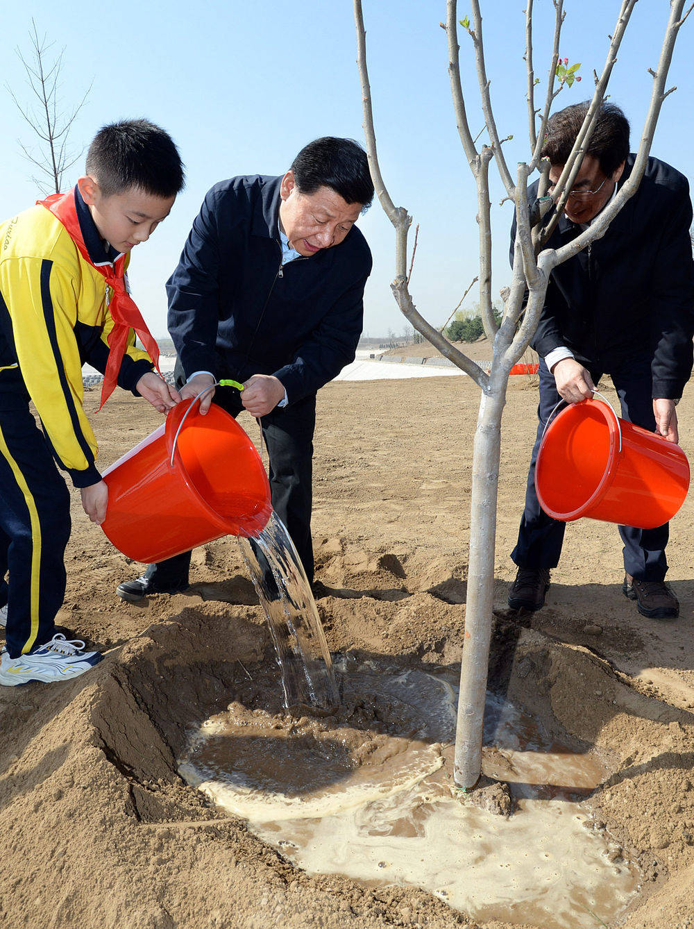 ▲2014年4月4日,党和国家领导人来到北京市海淀区南水北调团城湖调节池参加首都义务植树活动。这是习近平同大家一起给刚栽下的树苗浇水。植树结束时,习近平向工程负责人了解了南水北调水源的水质与保护和调节池施工进展情况。