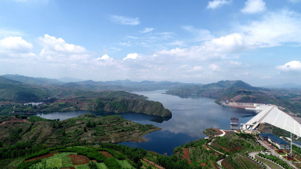 ▲位于河南省汝阳县前坪村的前坪水库,是一座以防洪为主,兼具供水、灌溉、发电功能的大型水利枢纽工程,是国务院确立的172项节水供水重大水利工程之一(无人机照片,4月26日摄)。