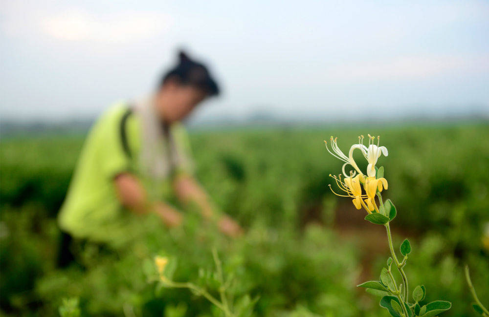 ▲农民在河南省淅川县九重镇中药材种植基地采摘金银花(2016年7月30日摄)。位于南水北调中线一期工程水源地的淅川县,通过发展金银花、软籽石榴、有机蔬菜等绿色生态产业,实现了生态保护和百姓增收的平衡发展。
