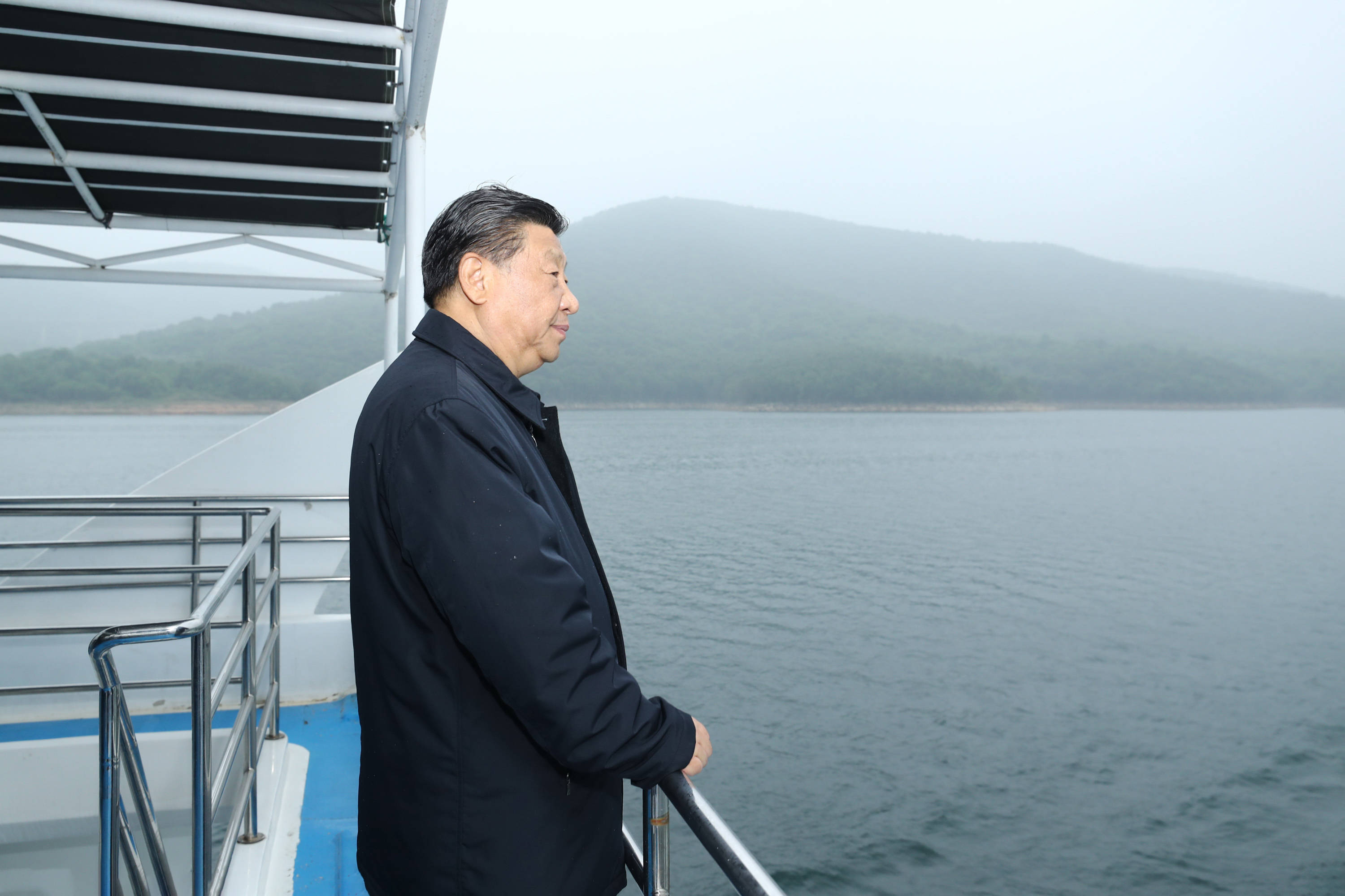 习近平总书记伫立船头,他的目光望向烟波浩渺的水、望向林木葱郁的山。