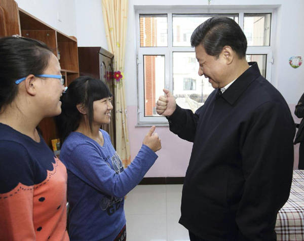 ▲2014年1月28日,习近平在呼和浩特市儿童福利院宿舍向聋哑女孩王雅妮(左二)和放假“回家”的大学生闫志净学习哑语“谢谢”。新华社记者 兰红光 摄
