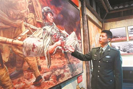 ▲在广西桂林全州县红军长征湘江战役纪念馆,全州红军长征湘江战役文化保护传承中心副主任周运良在油画《陈树湘》前讲解(4月25日摄)新华社记者 陆波岸/摄