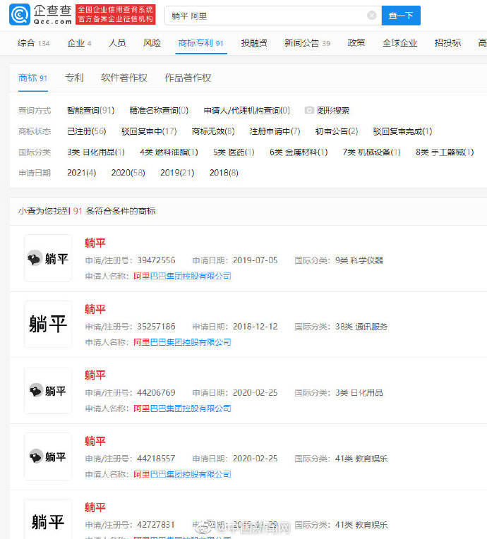 近日,“躺平”一词成功出圈火遍全网,其实早在2018年12月,阿里巴巴就曾注册躺平商标并开发相关应用。企查查App显示,阿里巴巴目前共申请注册躺平商标91次,其中56个商标已注册,包含躺平、躺平设计家、躺大平等。