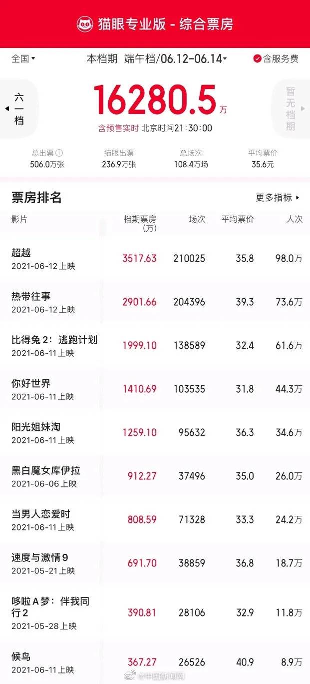 据猫眼专业版数据,截至6月12日21时30分,端午档总票房(含预售)达1.62亿。