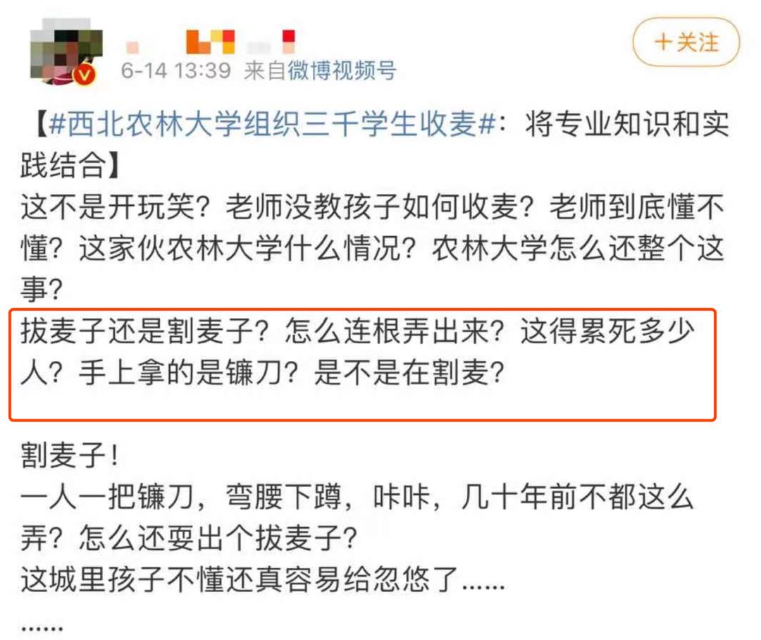 网友在点赞该校理论与实践结合的同时,却有人质疑校方有“作秀”之嫌,并批评部分同学不懂收割常识,将小麦“连根拔起”。