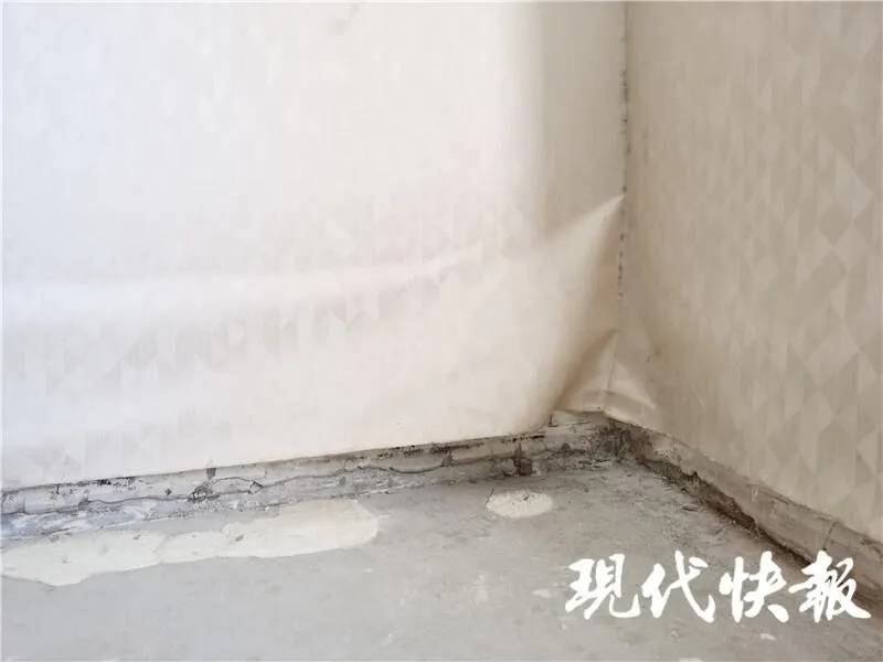 "这些原本都是我家的,就是因为房间漏水全都给泡坏了,所以才被物业拆下来临时堆放在这里。"说话间,张先生打开自家房门。进入房间后,记者看到张先生家的客厅与卧室之间有一截小过道,这里的地板已经全都被拆掉,而且过道两边墙纸靠近地面的部分,也因为受潮而起层脱落。