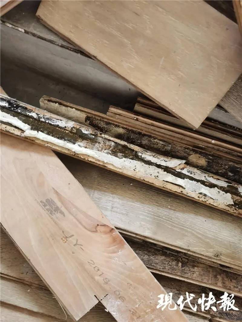 当天上午,记者来到了位于浦口区江浦街道新浦路111号的建熙花苑小区,在业主张先生带领下来到10幢的12楼。刚从12楼电梯口出来,记者就看到旁边的步行通道里摆放着很多木制地板。这些地板全都是使用过的,上面有明显的泡水痕迹,而且不少已经变形甚至发霉。