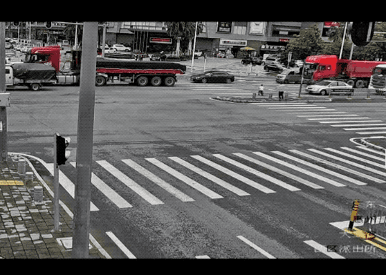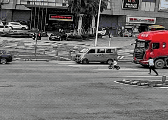 此时,一辆重载大货车正疾驰而至,男童的位置又属于大货车的视野盲区。