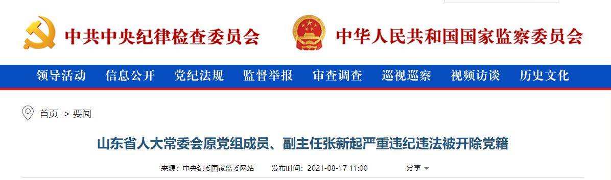 8月17日上午,中央纪委国家监委网站发布消息:日前,经中共中央批准,中央纪委国家监委对山东省人大常委会原党组成员、副主任张新起严重违纪违法问题进行了立案审查调查。