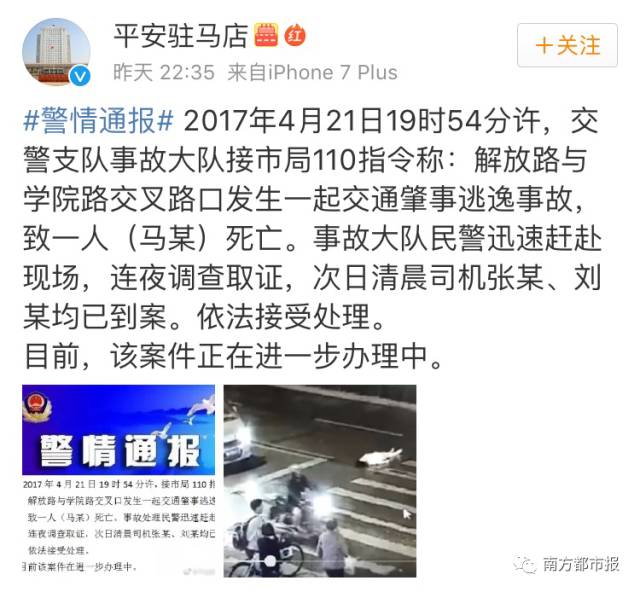 河南驻马店公安局6月7日深夜发布通报称,2017年4月21日19时54分许,交警支队事故大队接市局110指令称:解放路与学院路交叉路口发生一起交通肇事逃逸事故,致一人(马某)死亡。事故大队民警迅速赶赴现场,连夜调查取证,次日清晨司机张某、刘某均已到案。依法接受处理。