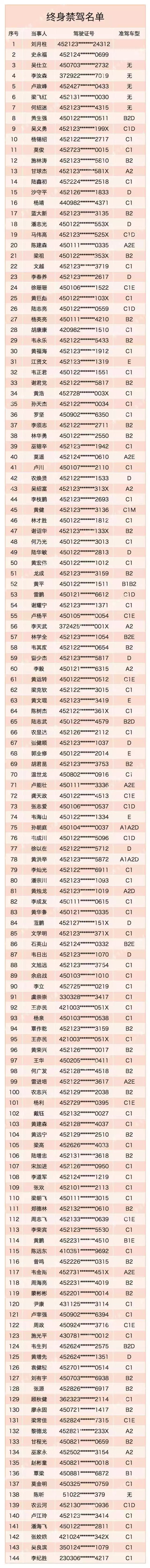 近日,南宁交警部门曝光了近年来终生禁驾人员名单,144人上榜!这些人终生不能考取驾照,不能驾驶机动车!