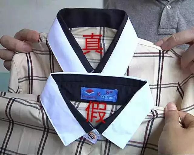 按最新的国标的话,校服领子已经不能车缝商标。假冒的校服,其吊牌合格证是不具备的。另外,假冒校服没有反光防伪标识。正品是有反光的标识。