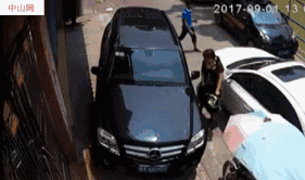 从其中一段监控中可以看到,一辆黑色小车停在路边,一名黑衣女子拍打车门,见司机无反应,又绕到副驾驶一侧试图开门。