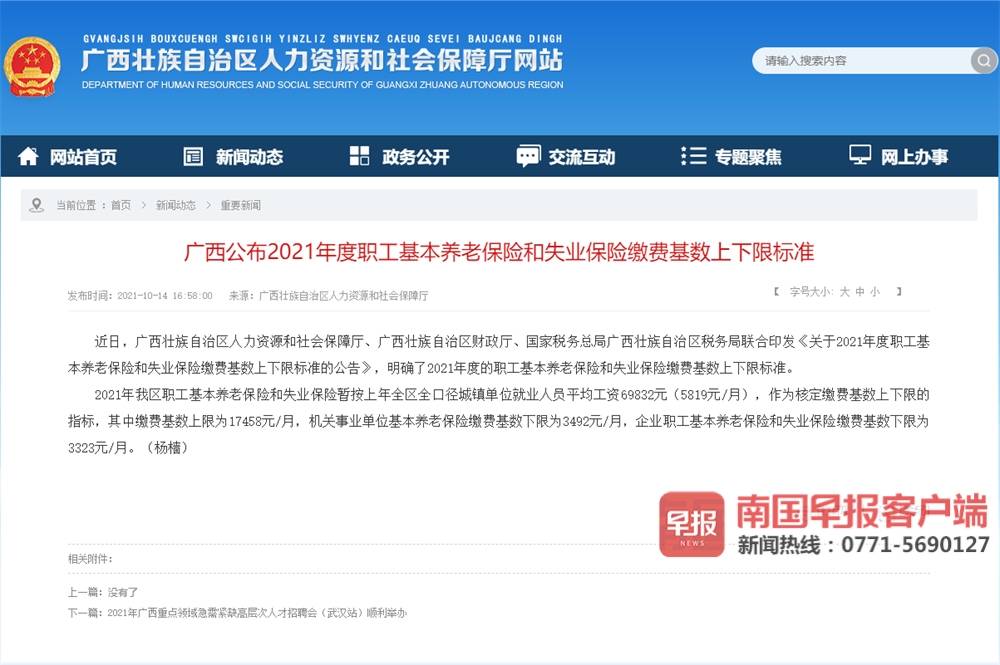 自治区人力资源社会保障厅、自治区财政厅和国家税务总局广西税务局联合印发的《关于公布2021年度职工基本养老保险待遇计发基数和缴费基数上下限标准的通知》,对上述信息予以公布。