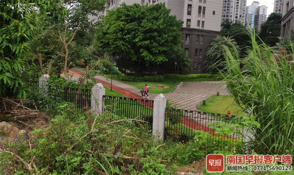 据悉,光明澜湾九里一期小区2015年交付使用,共有9栋住宅楼。南国早报客户端记者注意到,该小区位于那黄大道与五象大道交汇处,围栏外有一座数百米长的“7”字形土坡,土坡前半截位于那黄大道,上有很多垃圾、乱石和野草;后半截位于五象大道,绿化树枯枝老叶无人修剪,树下荒草丛生。