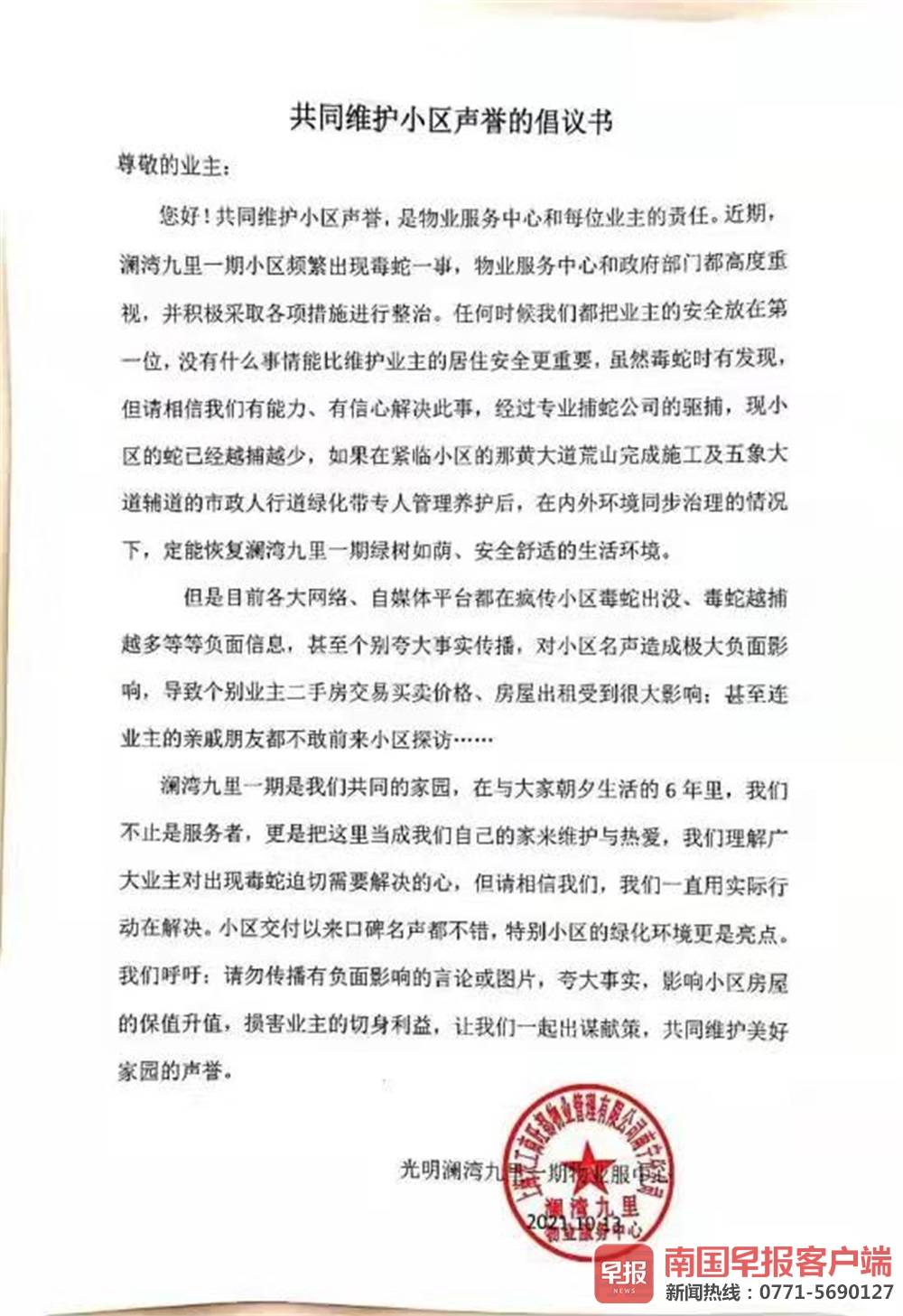 一些微信群、自媒体都在疯传小区毒蛇出没、毒蛇越捕越多等信息,夸大事实,对小区的声誉造成极大负面影响,为此,物业服务中心于13日发出了《公共维护小区声誉的倡议书》。