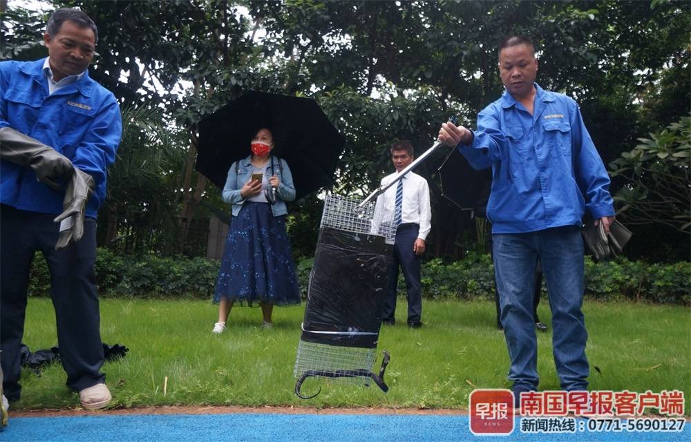 光明澜湾九里一期小区位于南宁市五象大道西段668号。14日上午,南国早报客户端记者来到该小区,目睹捕蛇专业人员又捕到一条眼镜蛇。