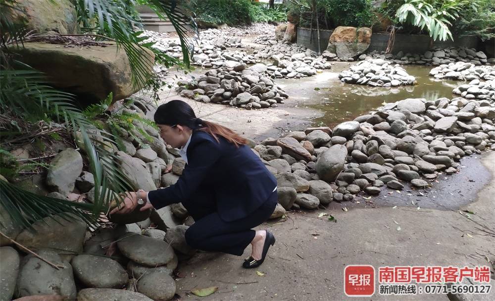 ▲为发现暗藏在水池的蛇,物业将小区水池抽干水查看。南国早报客户端记者 何定坚摄