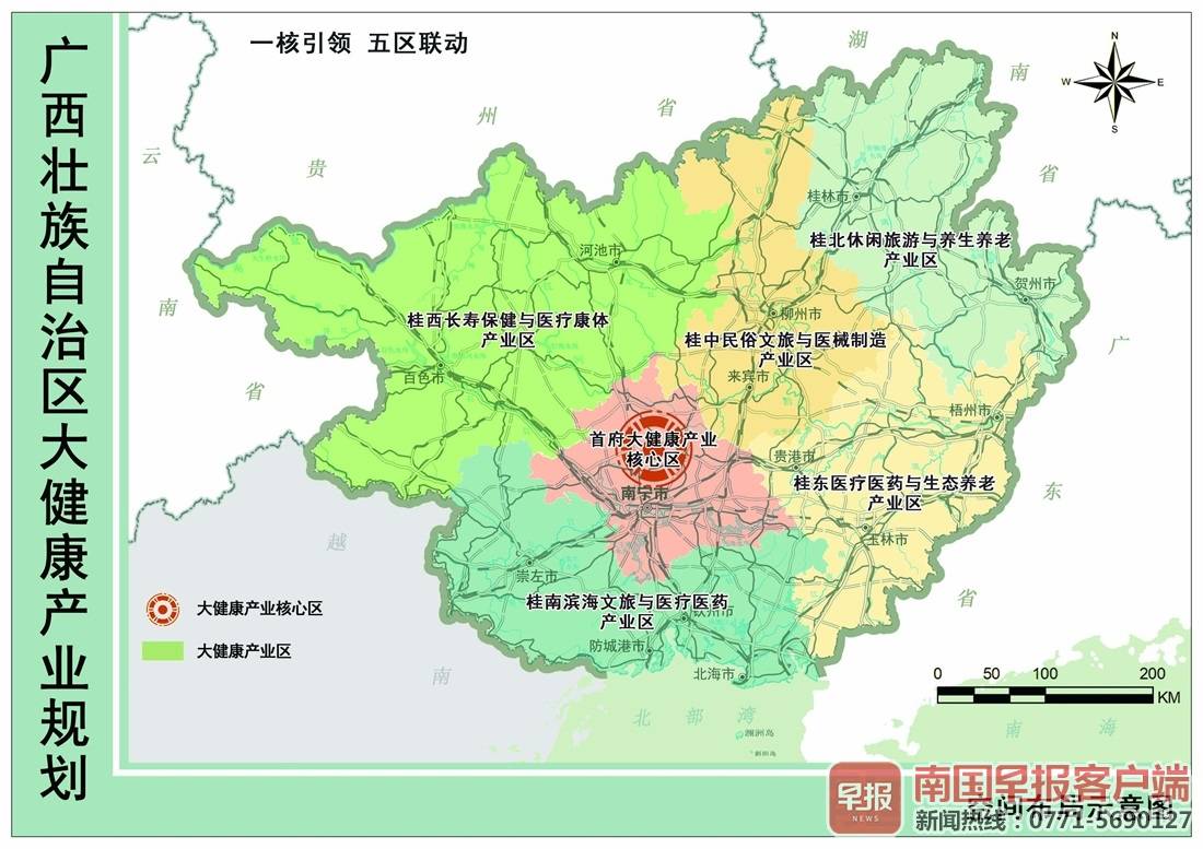 《规划》对广西大健康产业发展的空间布局,提出“一核五区多点协同”的发展格局。即以南宁市作为全区大健康产业发展核心区,引领带动桂北休闲旅游与养生养老产业区、桂南滨海文旅与医疗医药产业区、桂东医疗医药与生态养老产业区、桂西长寿保健与医疗康体产业区和桂中民俗文旅与医械制造产业区协同发展,推动我区健康养老、健康医药、健康食品等7大产业全面发展,把大健康产业打造成我区战略性支柱产业。
