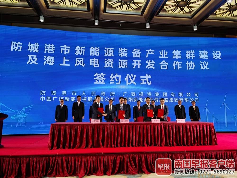 10月16日上午,防城港市政府与中广核新能源控股有限公司、广西投资集团、明阳智慧能源集团在南宁签订合作框架协议,四方将联手建设防城港市新能源装备产业集群建设及海上风电资源开发。