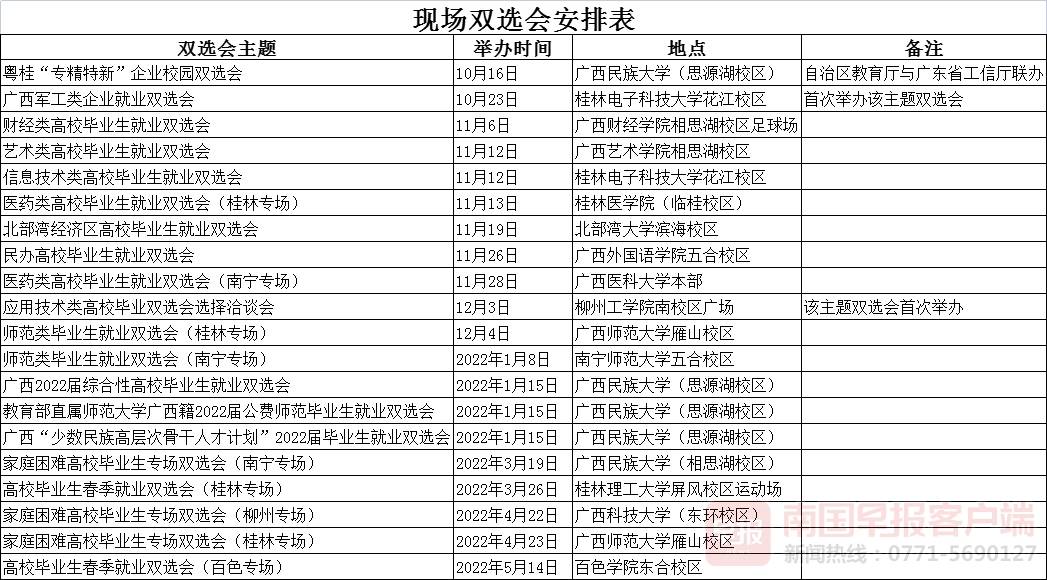 其中,现场双选会共20场,主要集中在南宁、桂林、柳州的高校举行。11月是举办现场双选会最集中的时间,共有7场双选会,2022年1月也有4场双选会,其中2022年1月15日,将在广西民族大学(思源湖校区)举行3场双选会,毕业生可特别关注。