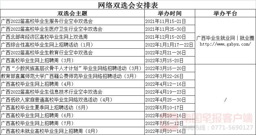 南国早报客户端记者从自治区教育厅获悉,为促进我区2022届普通高校毕业生充分就业,即日起至2022年8月份,教育厅将举办35场不同系列、不同类型的就业双选会。双选活动分不同主题,各用人单位和毕业生可根据自身实际需求选择参会。