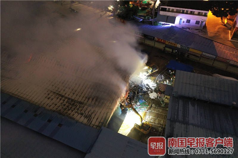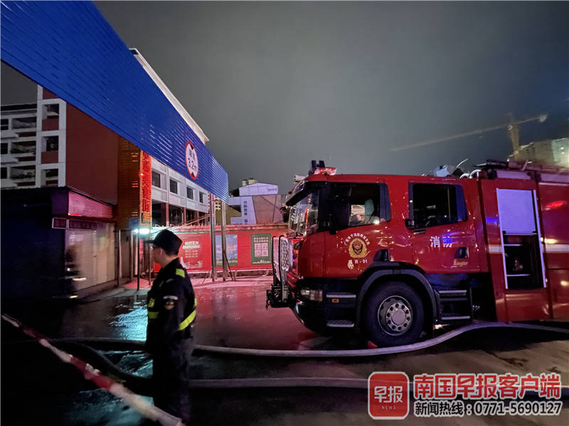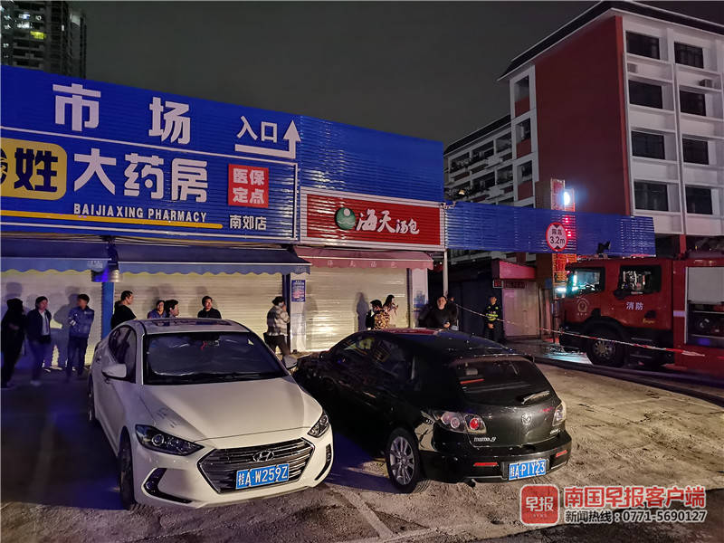 据了解,火灾现场位于南郊农贸市场内。10月18日0时35分,南国早报客户端记者赶到现场,现场弥漫着一股浓烈的焦臭味。记者在现场看到,南郊农贸市场入口处停有一排消防车,现场有数十名居民和商铺店主。