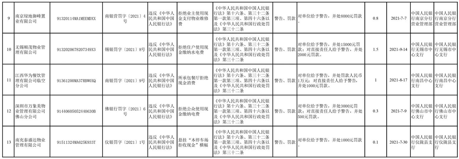 据悉,2021年三季度中国人民银行依法对13家拒收现金的单位及相关责任人作出经济处罚,处罚金额从1000元至50万元人民币不等。被处罚的单位包括交通、水电等公共服务机构以及大型商超、景区、停车场、保险公司等。