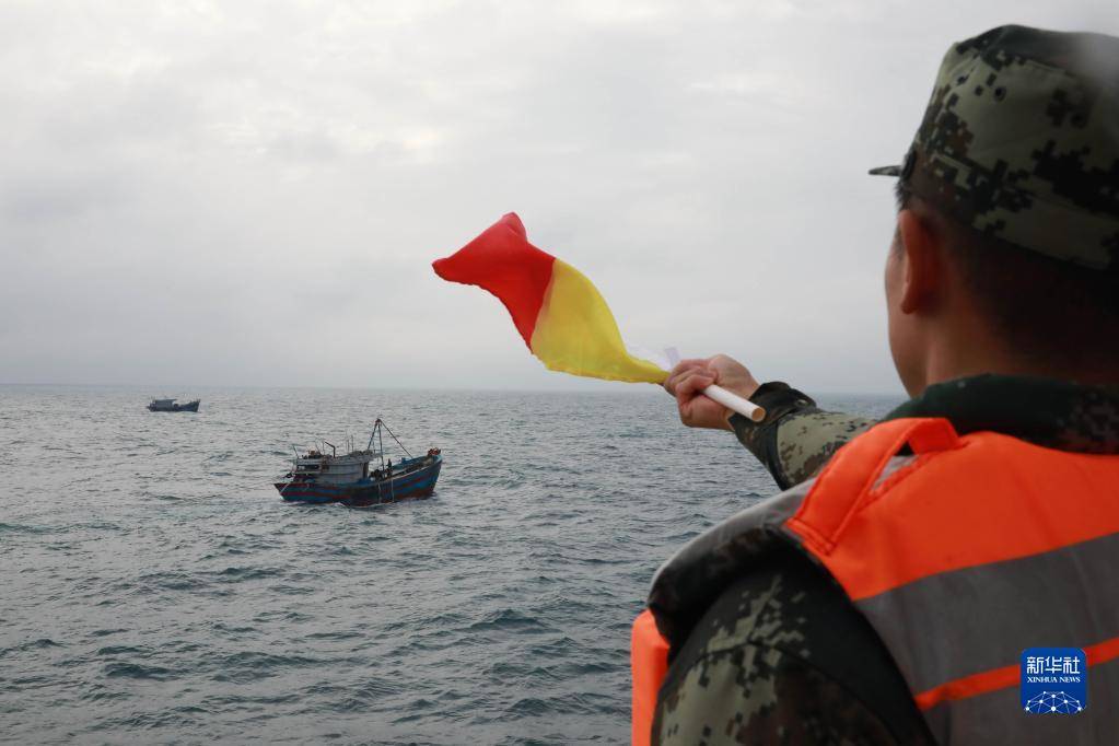 ▲中国海警执法员运用旗语对在北部湾海域非法捕捞的越南渔船进行驱离(10月19日摄)。新华社发 郑建清摄