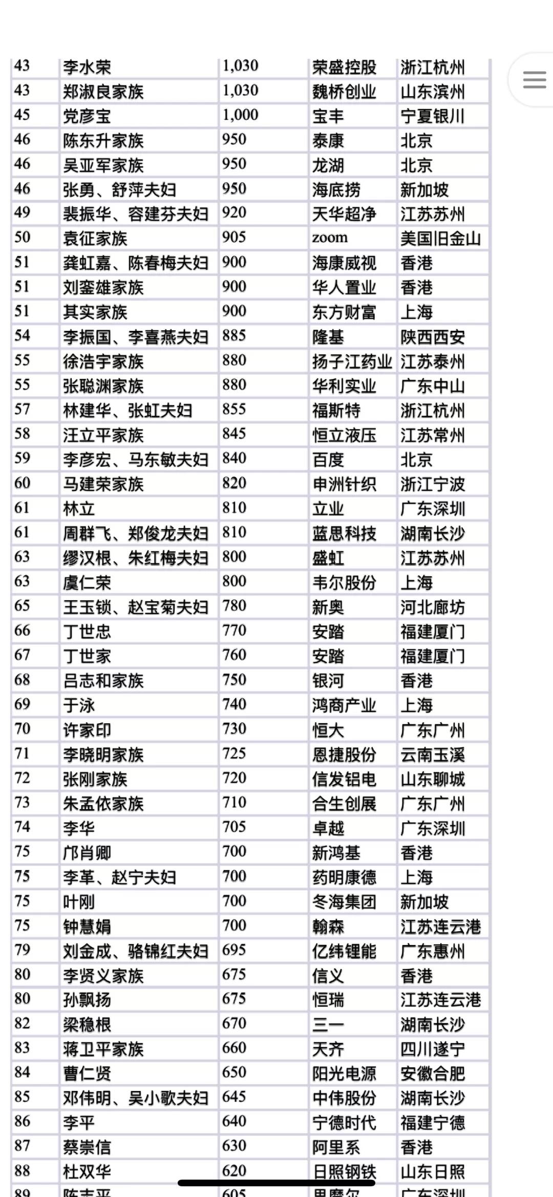 今年胡润百富榜前十名中4位新人:今日头条的张一鸣、宁德时代的曾毓群、长城汽车的魏建军、韩雪娟夫妇和长江实业的李嘉诚家族。前十名门槛为1930亿元。