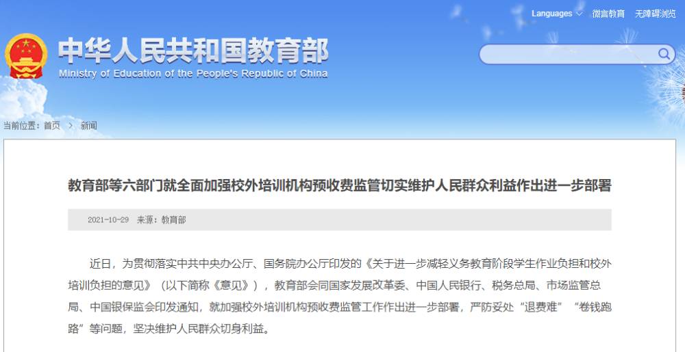 (原标题:教育部等六部门就全面加强校外培训机构预收费监管切实维护人民群众利益作出进一步部署)