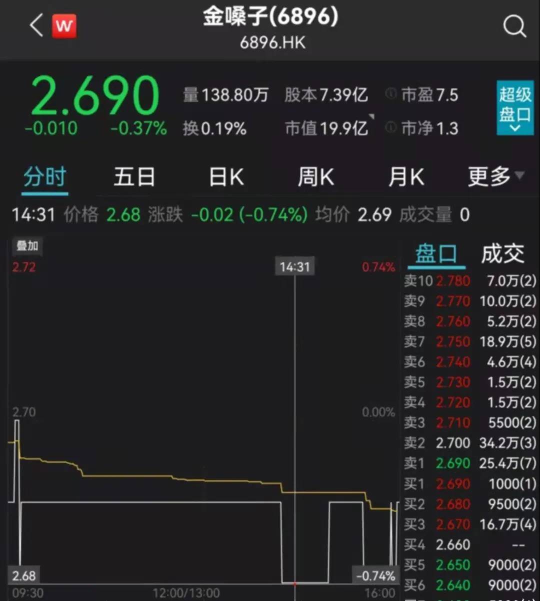 受此消息影响,30日金嗓子成交极其低迷,股价报收2.69港元,市值不到20亿港元。
