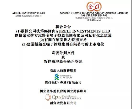 10月29日早上,金嗓子发布公告称,要约人(一间由创办人控股公司及亚赋控股公司间接全资拥有之公司)与本公司以通过协议安排方式将本公司私有化,将按每股计划股份2.80港元注销股份(较昨日收市价溢价3.7%)。