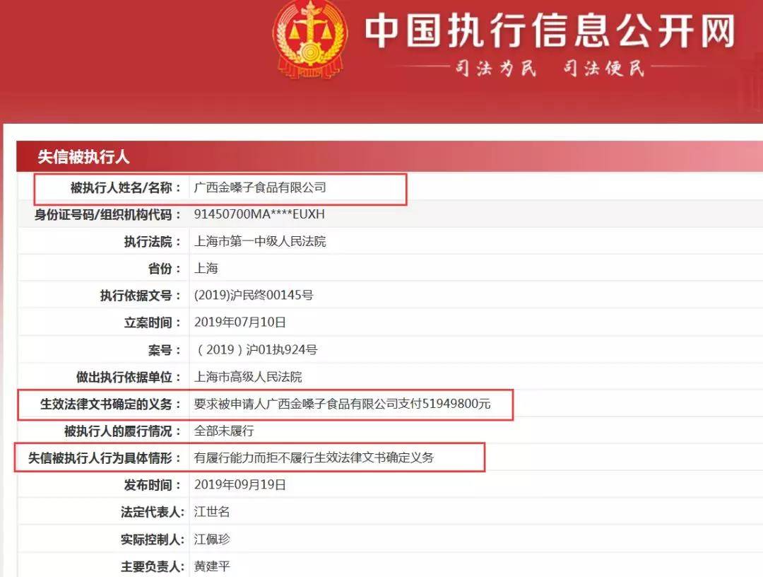 执行信息显示,广西金嗓子的具体失信情形为“有履行能力而拒不履行生效法律文书确定义务”,而之前法律文书确定的义务是“要求被申请人广西金嗓子食品有限公司支付5194.98万元”,截至被执行信息发布日广西金嗓子全部未履行上述义务。