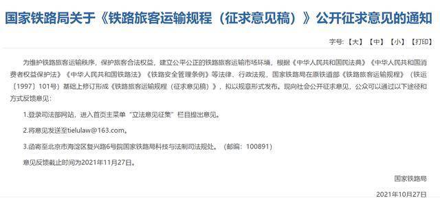 近日,国家铁路局就《铁路旅客运输规程(征求意见稿)》公开征求意见。相较此前规定,铁路客票儿童票拟由身高划分改为以年龄划分,还新增了霸座惩治规定。此次意见反馈截止时间为2021年11月27日。