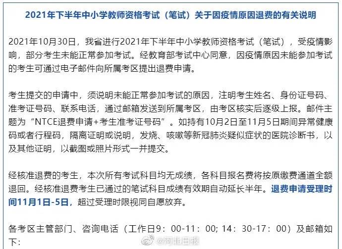 此外,据@四川日报 消息,部分考生因疫情无法正常参加四川省2021年下半年中小学教师资格考试(笔试),可向报考考区所在市(州)的招生考试机构提出退费申请。