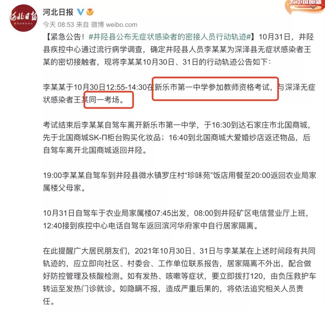 31日,石家庄井陉县疾控中心通过流行病学调查,确定井陉县人员李某某为深泽县无症状感染者王某的密切接触者。