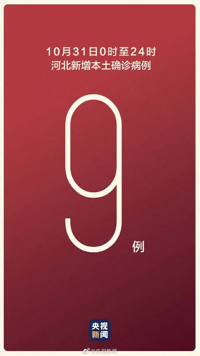 2021年10月31日0—24时,河北省新增新型冠状病毒肺炎确诊病例9例(石家庄市新增确诊病例6例、无症状感染者转确诊病例1例,保定市无症状感染者转确诊病例2例)。