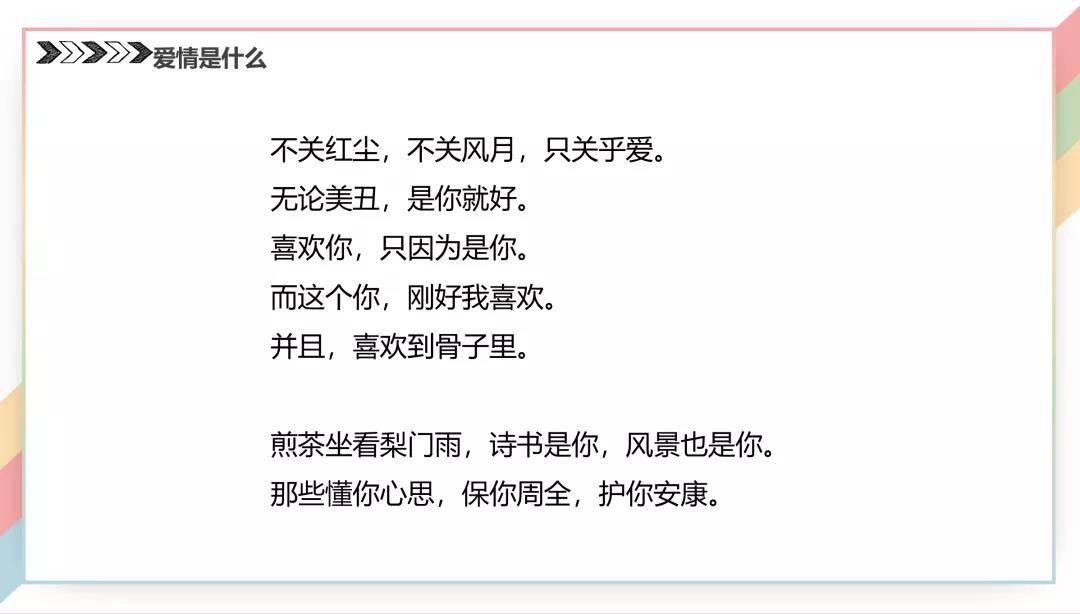 “谈恋爱不仅是谈恋爱而已,是让自己成为更好的人。作为生命本身,希望自己成为什么样的人,要达到什么条件,和那个人一起去探索和发现。”这个过程是不确定的,循序渐进的,需要边界的。在这里,让我们一起学习周老师的恋爱tips吧~甜甜的爱情不总是进行时,也会是过去时,变成咸咸的眼泪。即使说了再见,也请不要沉溺于悲伤之中,因为“一直苦苦追寻的那个人,很可能就是上帝随便给你发的一个礼物”。这可能是爱情的“失去”,却不是“失败”。不要因错过太阳而错过群星,也请不要因爱情的失去而否定自己。